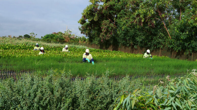 La pépinière d’Eramet Grande Côte produit jusqu’à 500 000 plants par an pour revégétaliser les dunes après exploitation. Elle cultive principalement du filao, du darcassou et de l’eucalyptus, appréciés par les communautés locales. Une équipe de 70 spécialistes travaille avec des sous-traitants issus de Groupements d’Intérêt Économique (GIE), formés dans le cadre des programmes de développement pour accéder aux marchés environnementaux.
